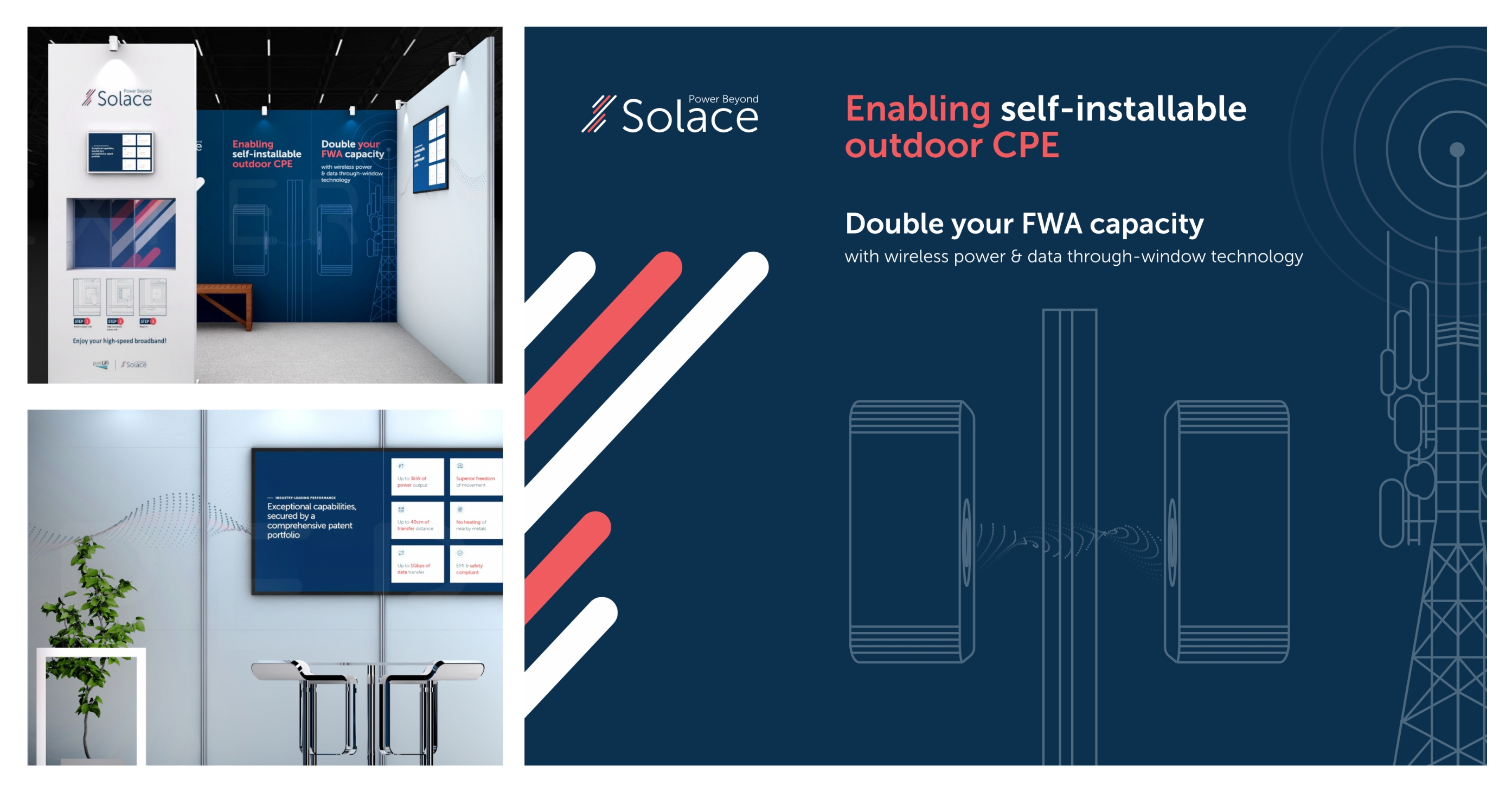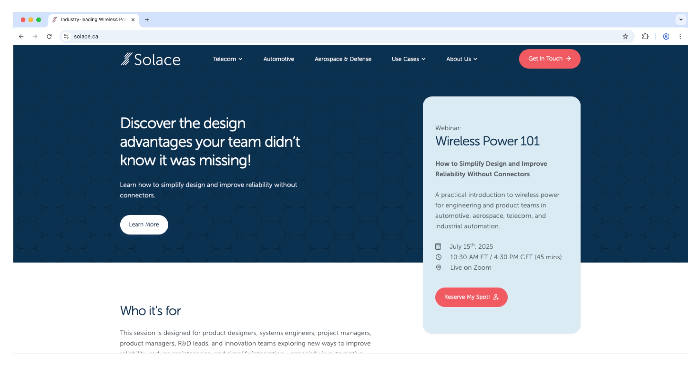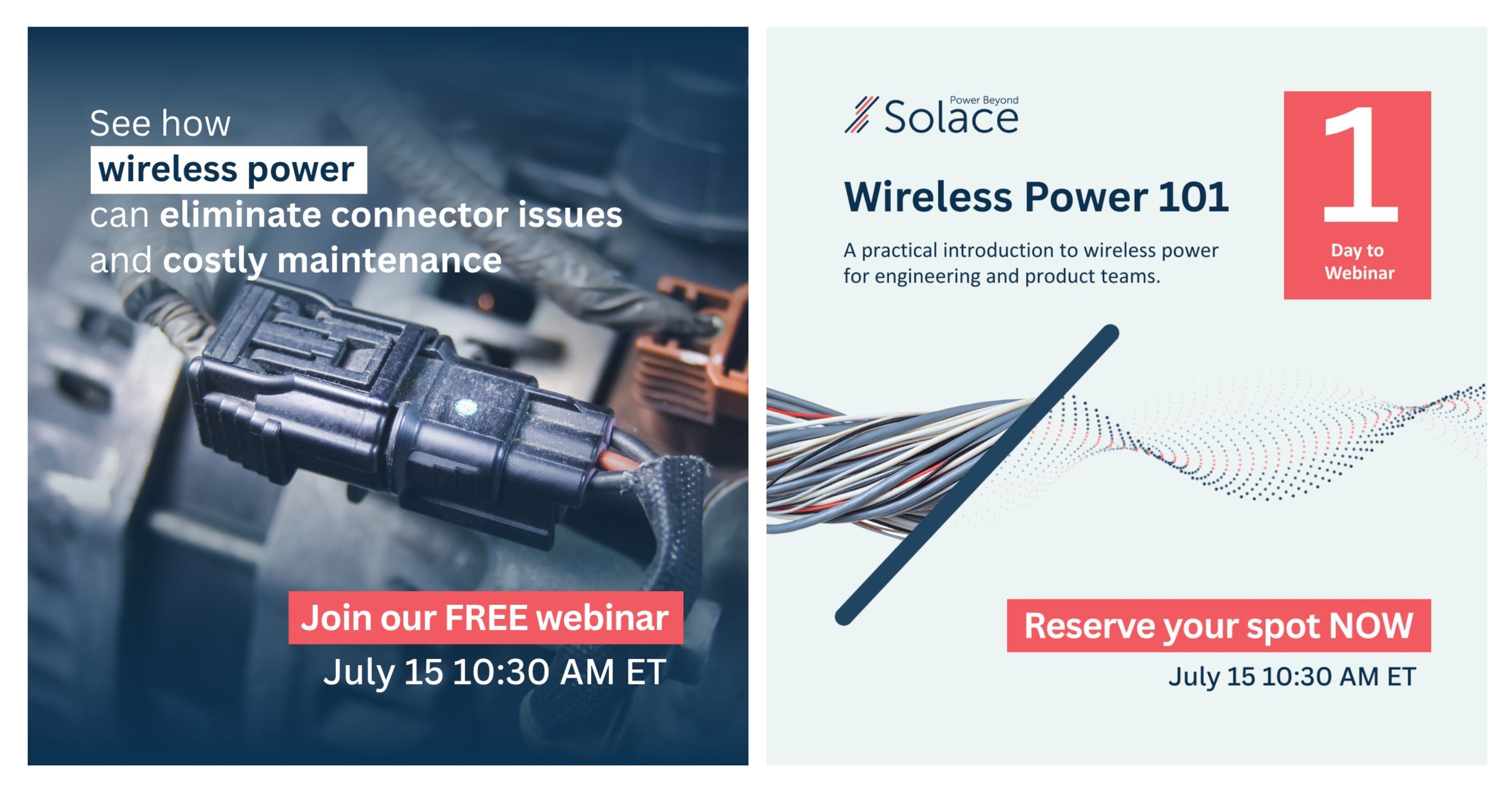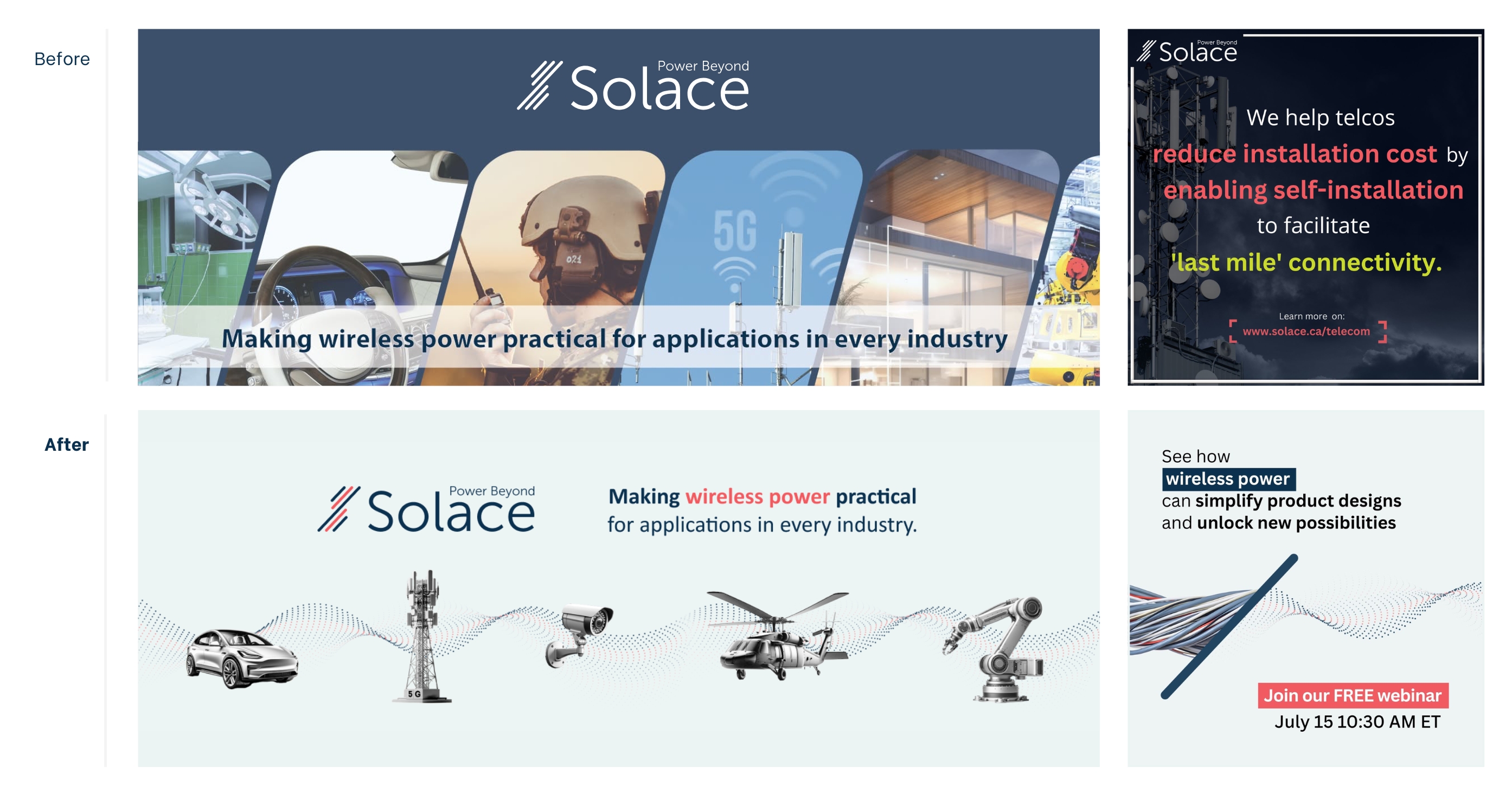 In an effort to drive more interest in key markets and generate leads, a dedicated set of marketing materials was created to support multiple webinars, this work included the layout and design of the slide deck, presentation graphics, and promotional social assets. The visuals and narrative were crafted to position Solace Power as a thought leader and subject-matter expert in wireless power technology, while clearly communicating real-world use cases in telecom and automotive markets. This cohesive approach successfully attracted strong interest from large enterprise companies.